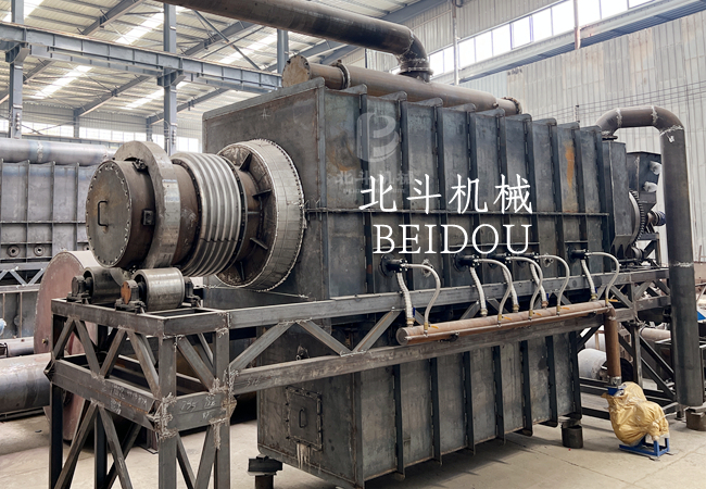 本機(jī)采用滾筒干餾炭化工藝,充分利用炭化過(guò)程中產(chǎn)生的廢煙氣,經(jīng)煙氣回收凈化系統(tǒng)得到再利用。果殼炭化機(jī)內(nèi)部有雙套筒管道,內(nèi)筒為干燥預(yù)熱管道,外筒為高溫炭化管道,利用炭化煙氣對(duì)原料進(jìn)行干燥炭化。同時(shí),果殼的炭化使產(chǎn)品具有初步的活化和一定的碘值,為下一步制備優(yōu)質(zhì)的果殼活性炭打下良好的基礎(chǔ)。